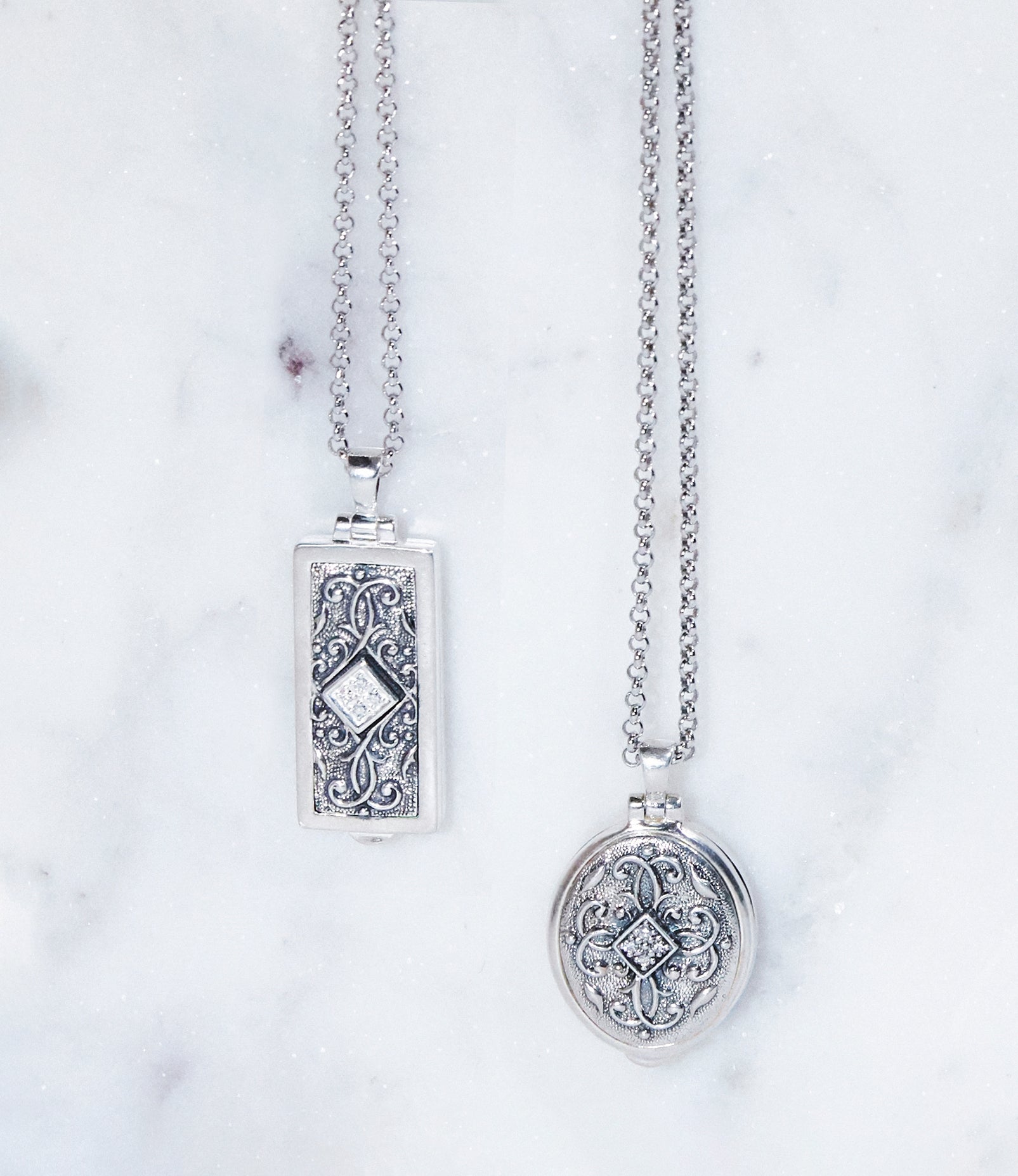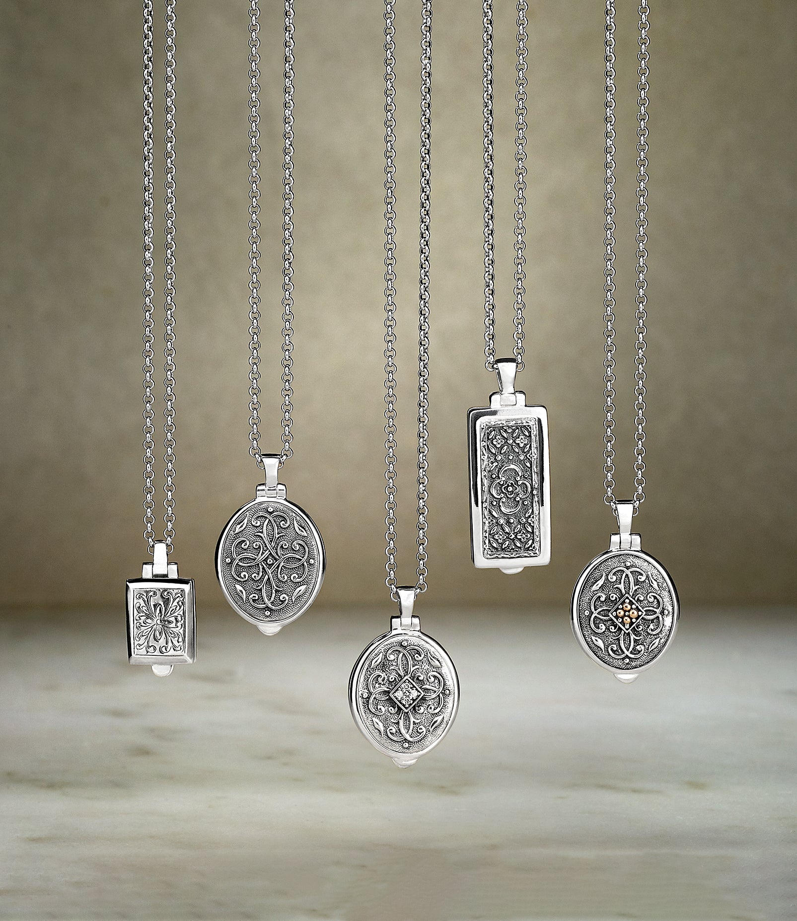 The designers created this sentimental locket collection when their first daughter, Katia, was born. Their inspiration was drawn from rich medieval repoussé wrought ironwork, rendered exquisitely in this collection.