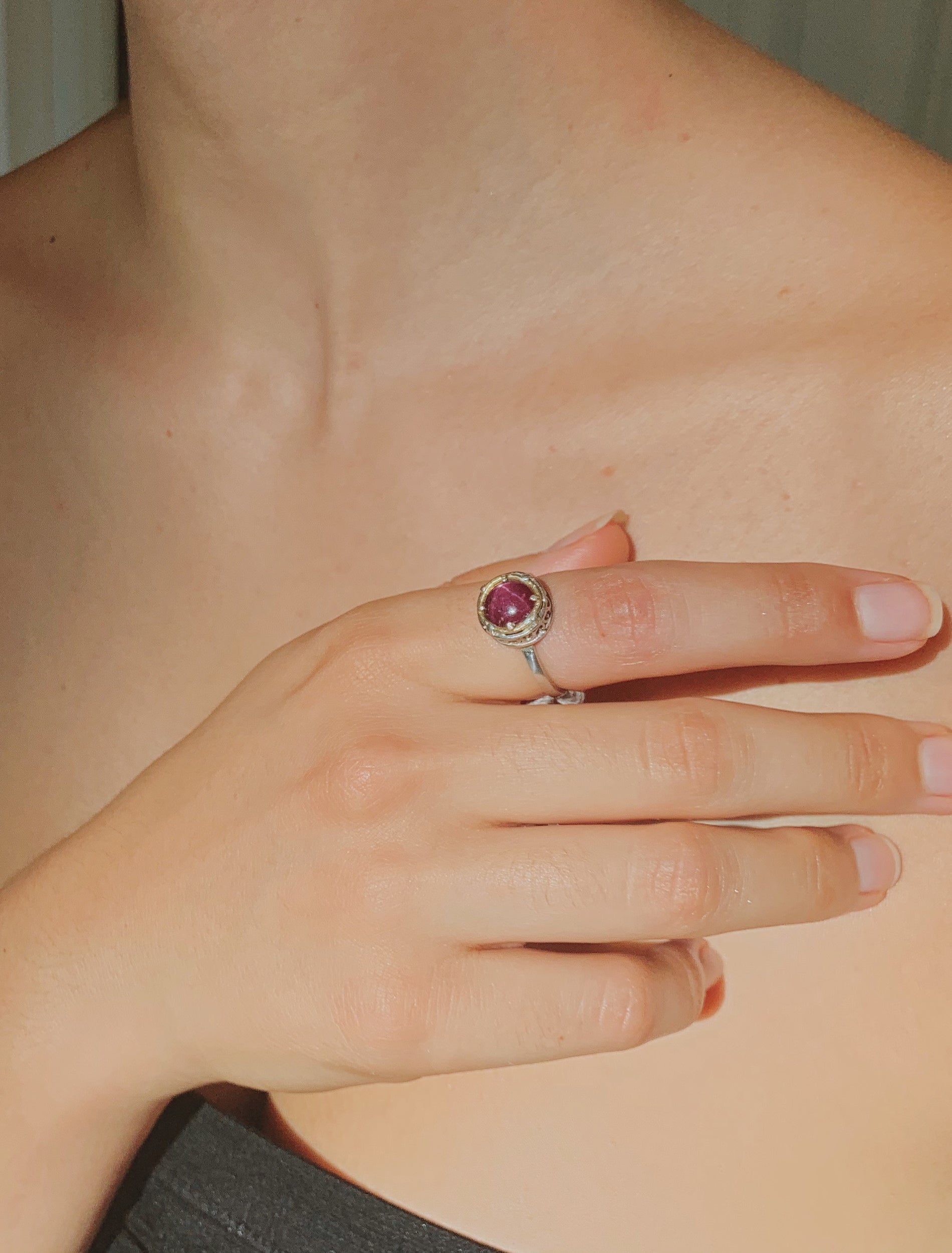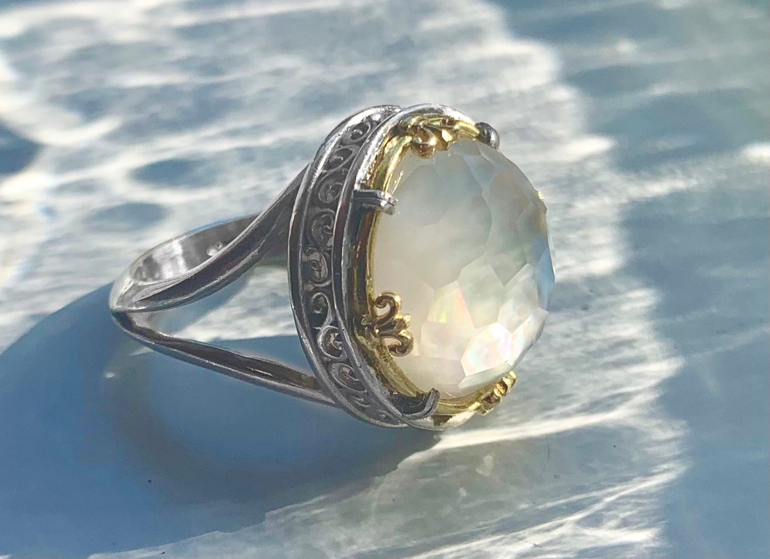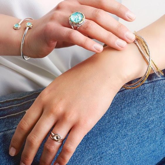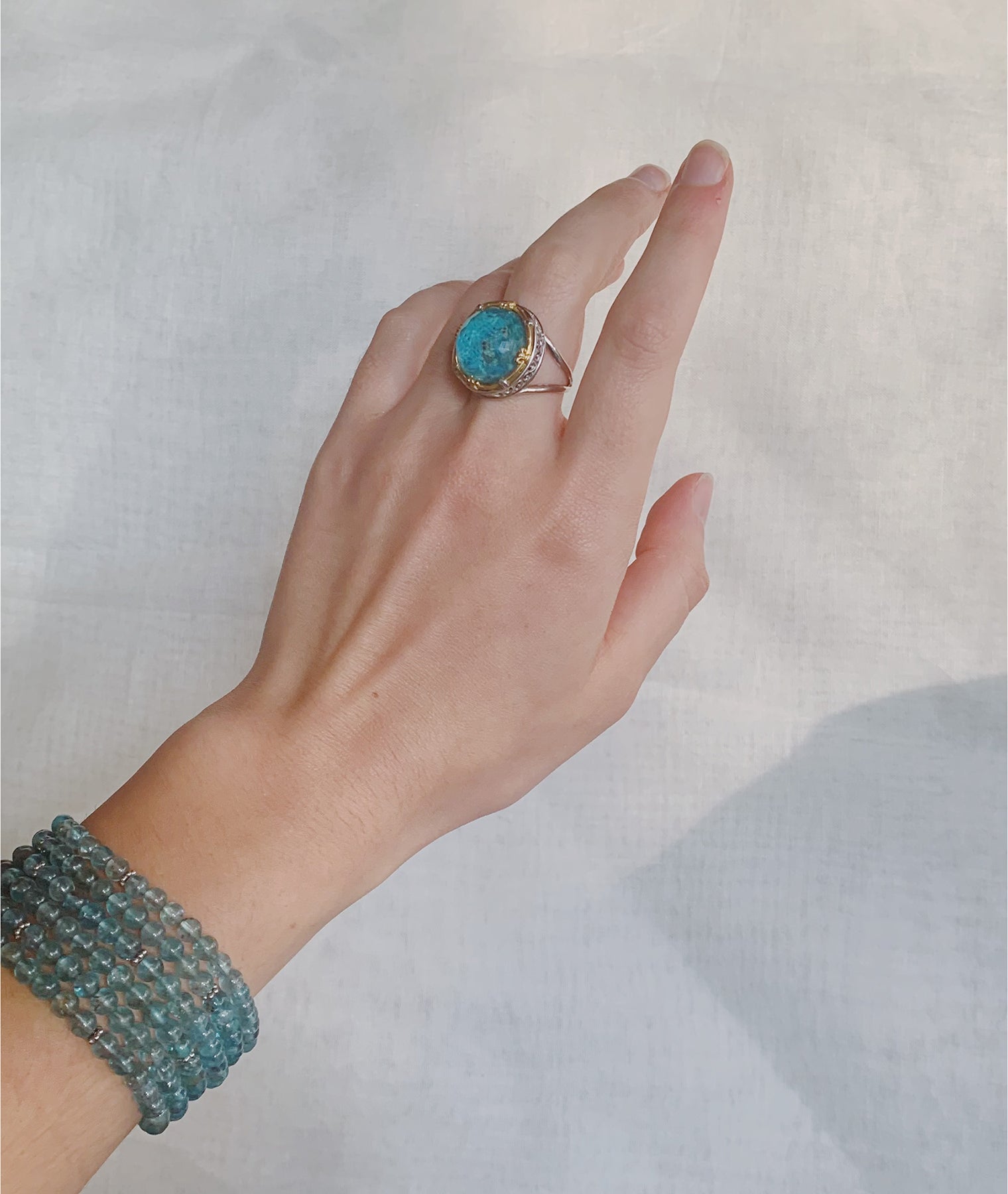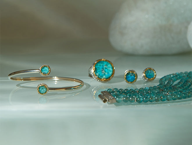 Hand wrought in sterling silver and 18k vermeil, the Minoan Collection is inspired by the colors ubiquitous on the beautiful Greek Island of Crete, where Cathleen and Kostas met. It is an ode to the vibrant landscapes of Greece, and evokes scarlet sunsets, sparkling beaches, rocky cliffs, and turquoise seas. It is also an ode to the ancient Minoans, who also called Crete home, and their beautifully illustrated frescoes.