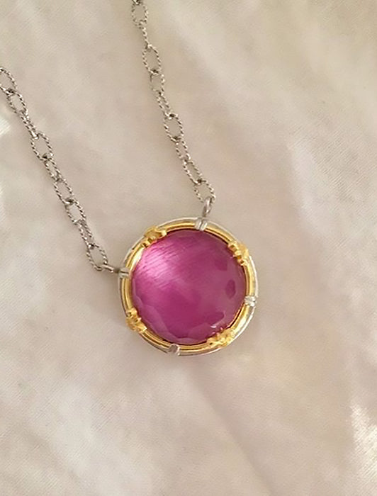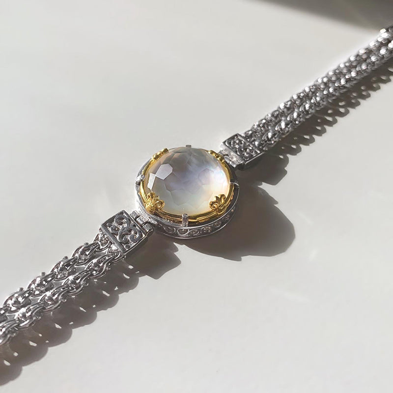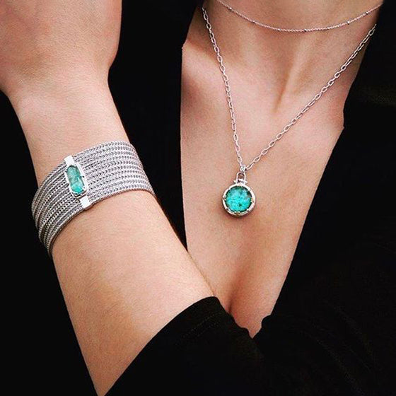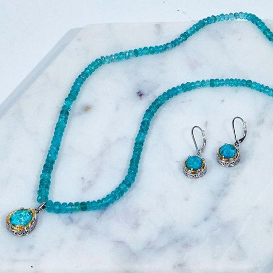 A color palette expressed in chrysocolla, ruby, and mother of pearl, beneath a surface of light-reflecting faceted rock crystal.